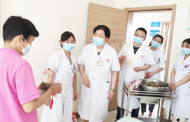 病区一位病人家属激动地说:医院为我们考虑得太周到了,这是我吃到的最有爱心的粽子,像回到了家里一样,谢谢你们!