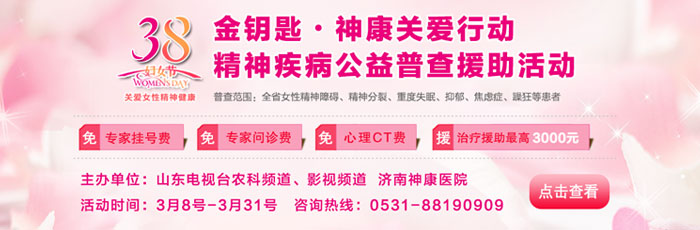 我们每个人都应该尊重女性,爱护女性。三八妇女节到来了,您身边有没有女性朋友还在被失眠、抑郁(产前抑郁、产后抑郁)、更年期综合症、头痛头晕、神经衰弱、精神分裂等精神心理疾病所困扰,使生活和工作受到严重影响。为减轻广大女性的疾病痛苦,由山东电视台影视频道、山东电视台农科频道、济南神康医院共同发起的“金钥匙•神康关爱行动”暨3.8妇女节精神疾病公益普查援助活动将于3月8日至3月31日在全省范围内开展。